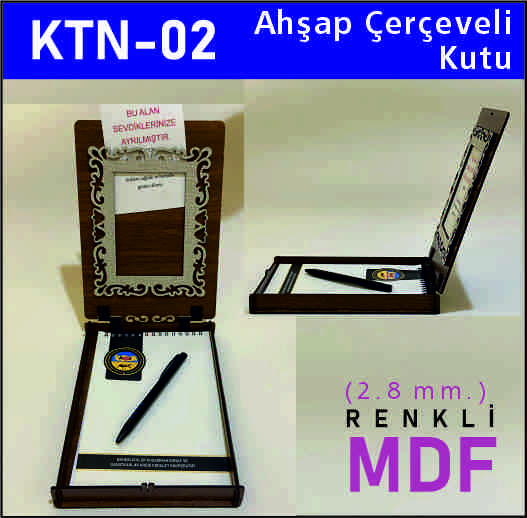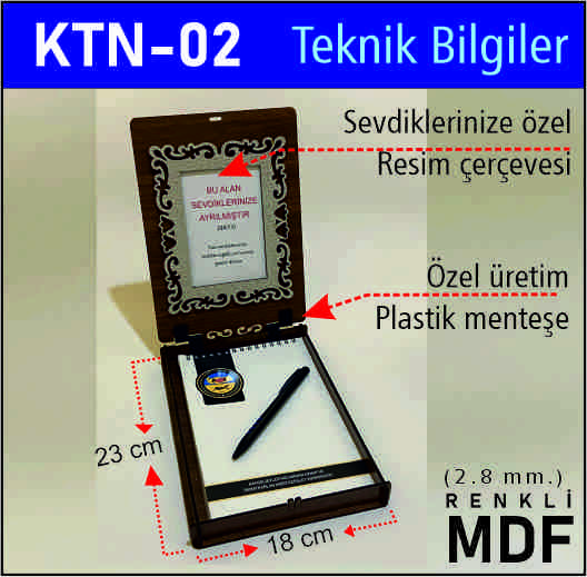 Renkli 2.7 mm. MDF den üretilmiştir. Kapak içinde Resim çerçevesi vardır. 15x20 Bloknot rahat sığar ve logolar lazerde kazıma yöntemiyle yapılmıştır