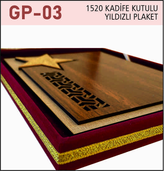 Kadife kutulu, Lazer kesim ahşaplı özel çalışma plaket. Altın rengi metale baskı yapılarak logo ve yazı baskı yapılarak hazırlanır.