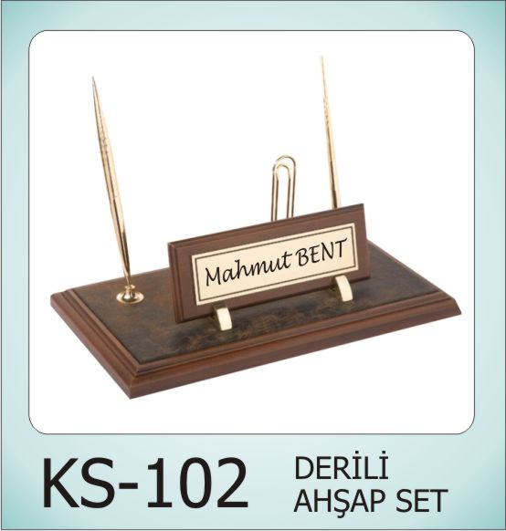 Özel olarak ahşaptan üretilmiş, kısmi DERİ kaplı, Kalemi ve notluk (post-it) bulunan Sarı Metal ile İSİM yazılan masa isimliği