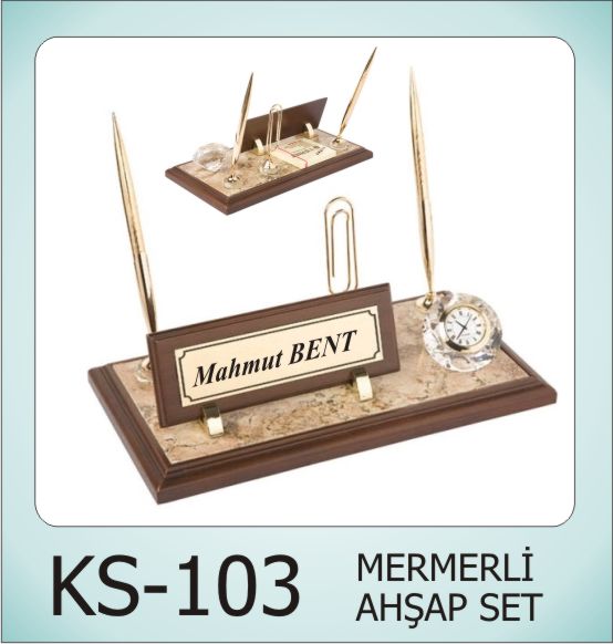 Özel olarak ahşap ve Mermerden üretilmiş, Kalemi ve notluk (post-it) bulunan Sarı Metal ile İSİM yazılan masa isimliği