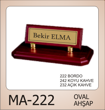 Ahşap (mdf) dan hazırlanmış olup, İsim yazılacak ahşap yapılmıştır. prinç rengi metal üzerine isim yazılmaktadır.