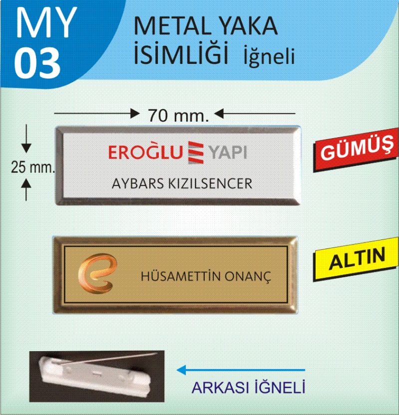 Metal isimlik, Yazı alanı metal üzerine renkli baskı Arkasında bulunan İĞNE ile takılır.