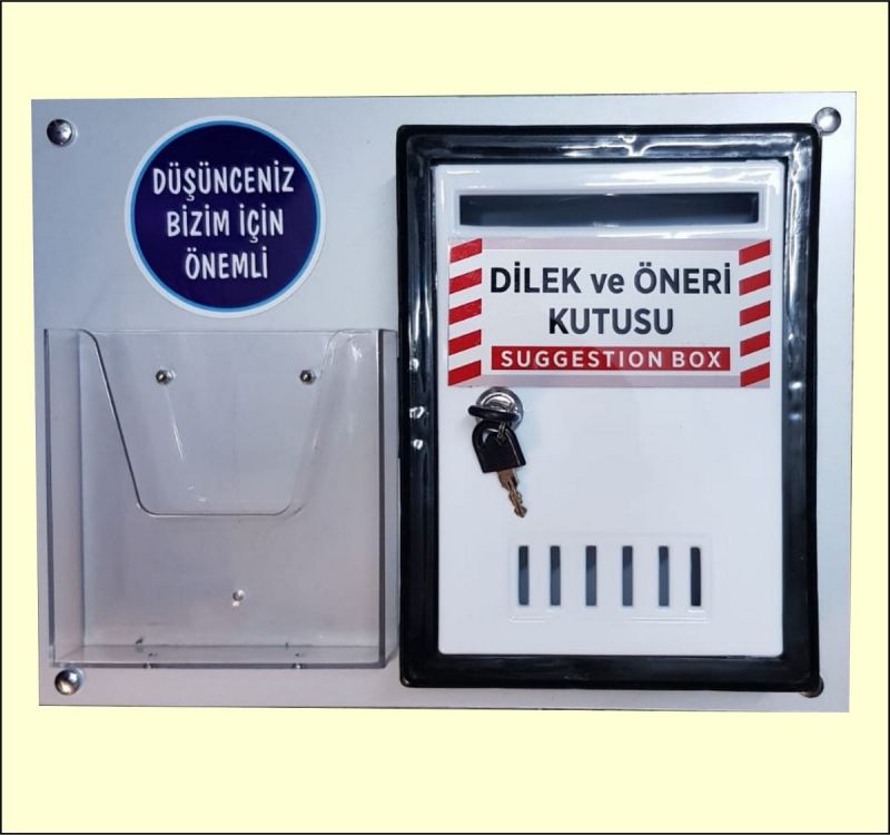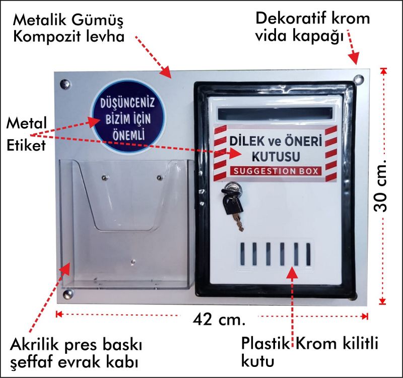 Kompozit levhaya monte edilmiştir. Plastik kutu krom kilitlidir. A5 Akrilik cep, Dilek ve Öneri Kutusu yazısı metal baskıdır. KARGO DAHİLDİR.