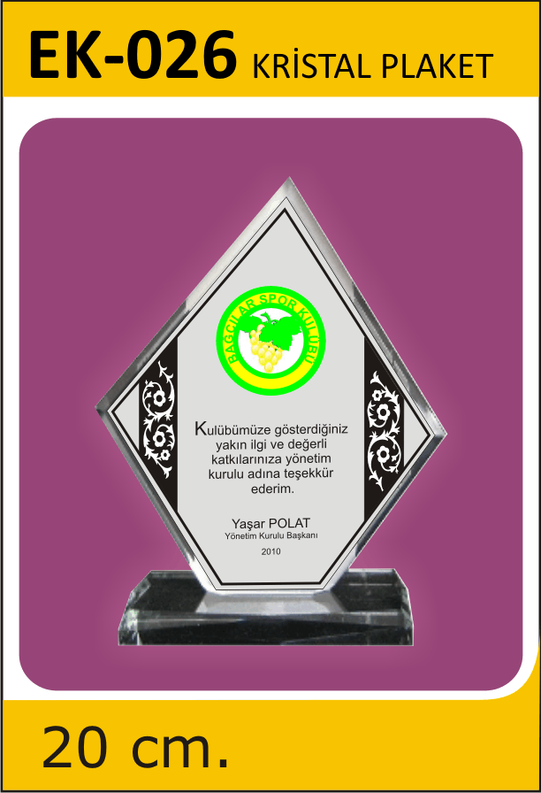 Özel olarak tasarlanıp kesilmiş kristal plaketler el işçiliğidir. Grafik metal üzerine baskı yapılarak monte edilir. Özel Mukavva kutusu vardır.